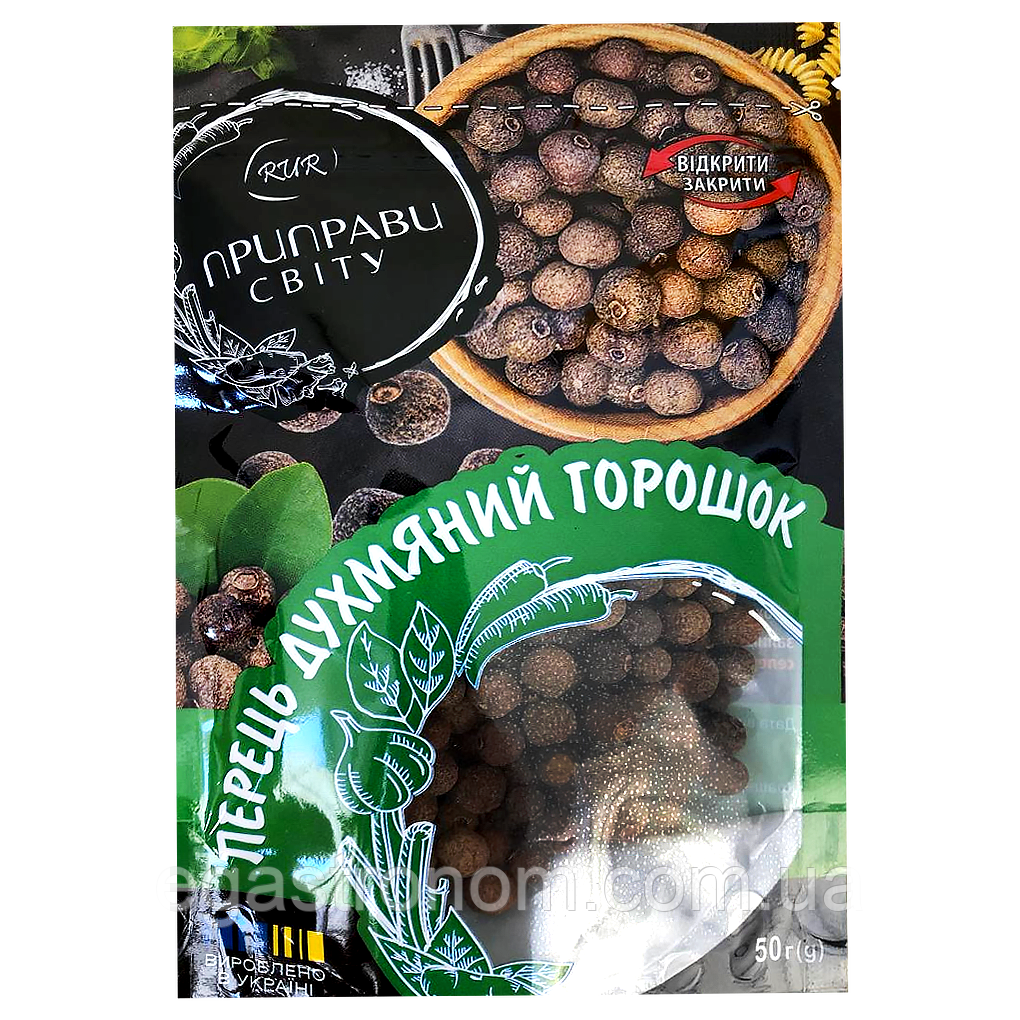 Духмяний перець в упаковці дой-пак. Використовується для ароматизації страв з м'яса, овочів і супів.